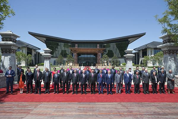 5月15日,“一帶一路”國際合作高峰論壇在北京雁棲湖國際會議中心舉行圓桌峰會,國家主席習近平主持會議并致辭。這是當天中午,習近平同與會領導人和國際組織負責人以國際會議中心“漢唐飛揚”主建筑為背景集體合影。(姚大偉 攝)