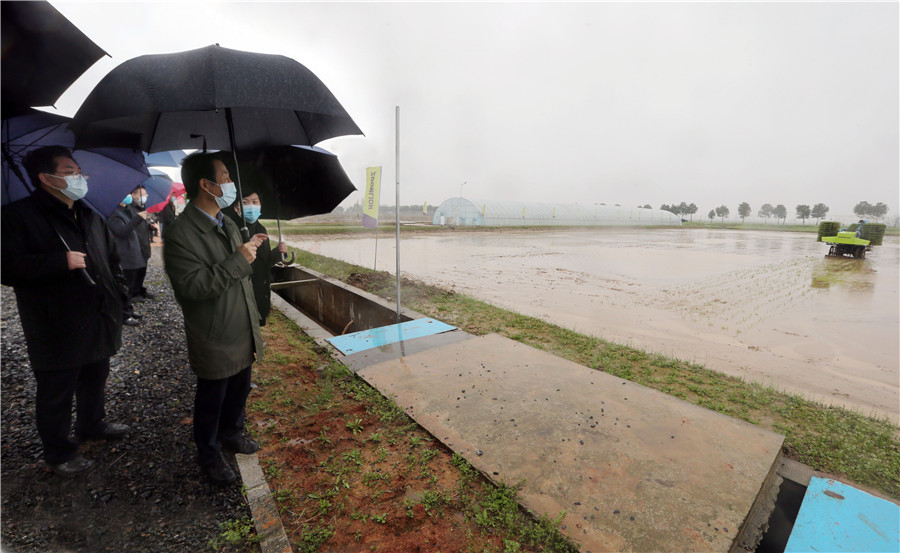 △許達(dá)哲觀看中聯(lián)重科智慧農(nóng)機(jī)產(chǎn)業(yè)園新下線的高速有序拋秧機(jī)演示拋秧作業(yè)。圖片來(lái)源:新湖南客戶端