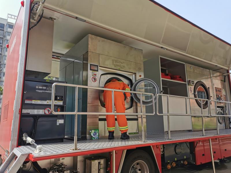 據(jù)介紹,中聯(lián)重科大型被服洗滌車結(jié)合洗滌設(shè)備特點和應(yīng)急救援實戰(zhàn)中衣物洗滌需求創(chuàng)新設(shè)計而成。被服洗滌車工作能力強大,單次工作(約一小時)**大可洗脫、烘干100kg衣物,能將臟衣物快速處理成潔凈、干爽的衣物。同時,車輛采取獨有專利技術(shù),全程一鍵控制,自動選擇洗滌參數(shù),滿足多種消防衣物洗烘需求,快捷高效。此外,車輛還擁有舒適的工作環(huán)境,裝備了超靜音發(fā)電機和靜音水泵,有效降低工作噪聲。作業(yè)空間大,超大儲物容積可滿足多種儲存需求。