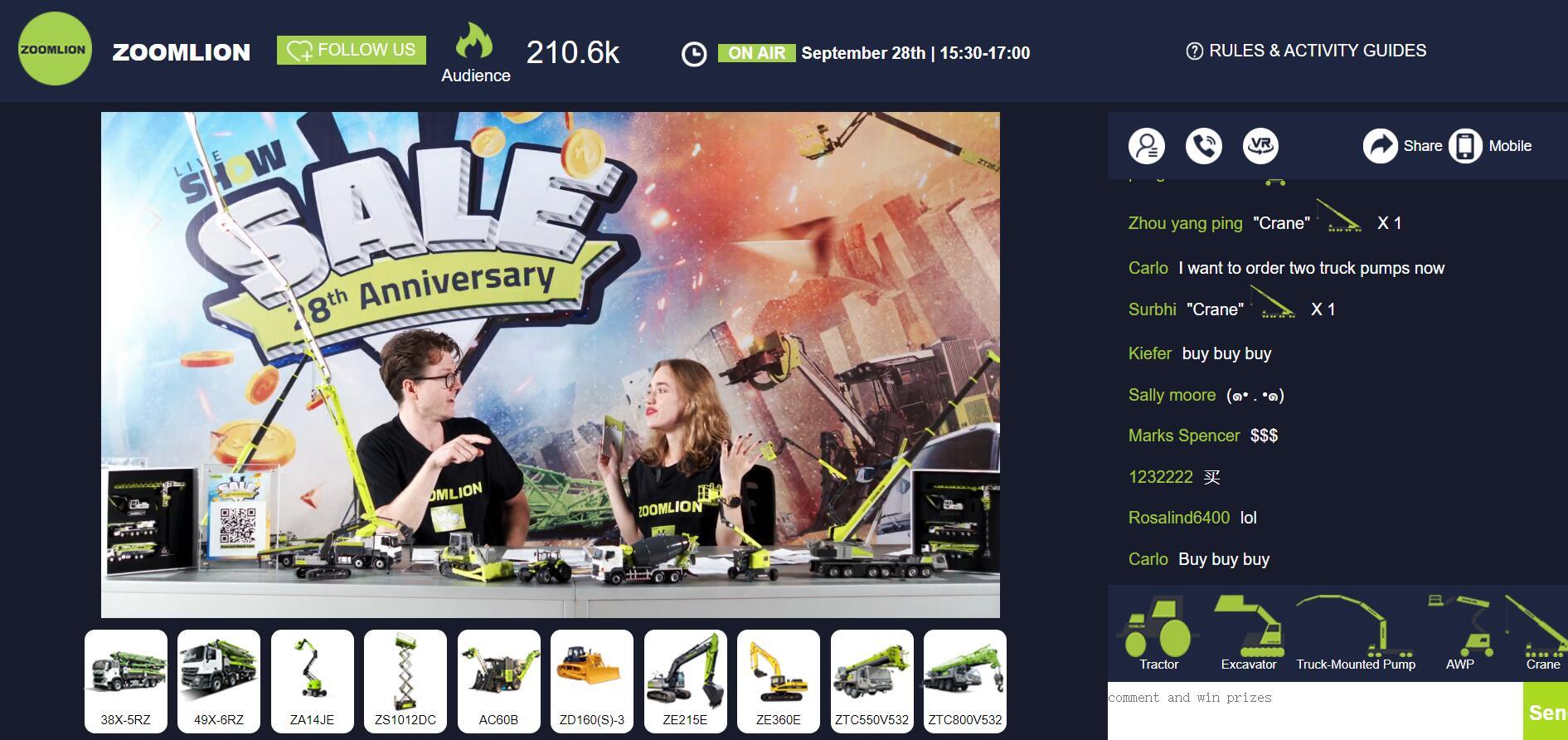 9月28日下午,中聯(lián)重科“928海外嗨購(gòu)節(jié)”盛大舉行,活動(dòng)吸引了來(lái)自全球各地的客戶、代理商觀摩,在線觀眾數(shù)量突破23萬(wàn),并以2.06億元的帶貨成果為海外直播寫下了良好的開(kāi)篇。