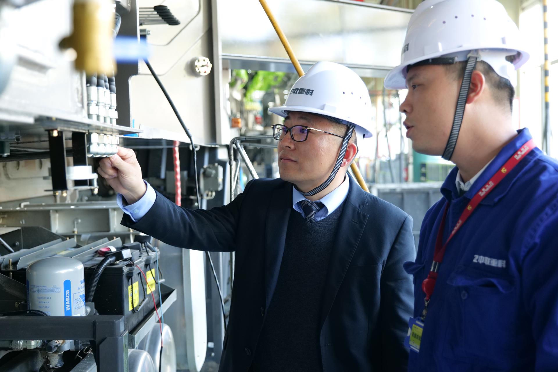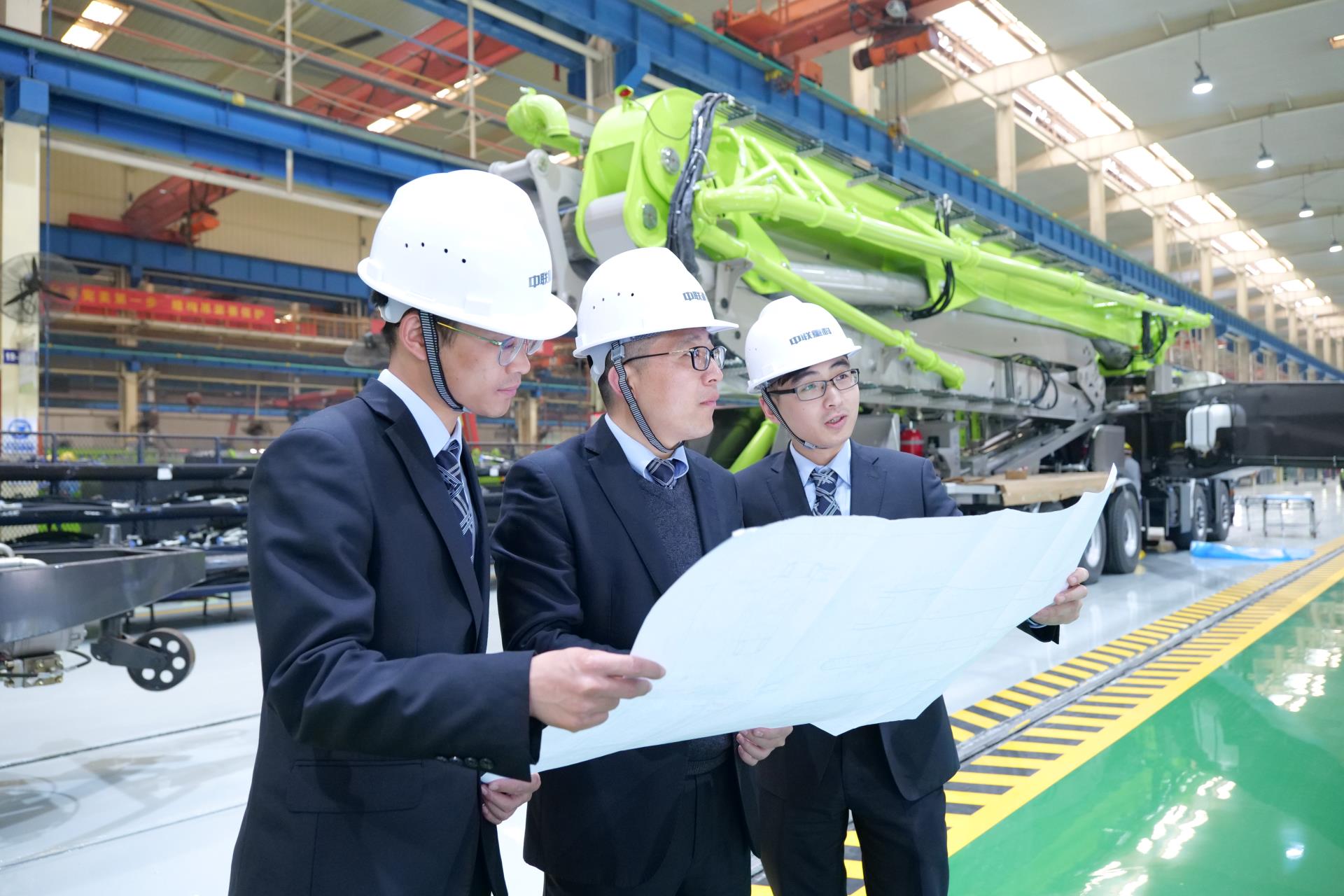 中聯(lián)重科混凝土泵送機械分公司研發(fā)中心經(jīng)理高榮芝(左一)在車間研究泵車裝備。朱莉 攝