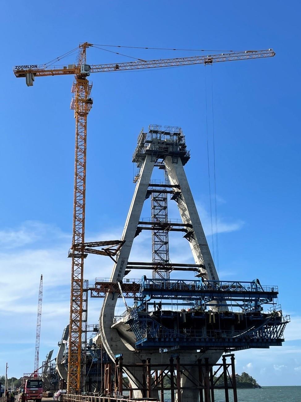 憑借著輕載高速、重載低速的技術(shù),中聯(lián)重科TC7013-10E塔機(jī)穩(wěn)定、高效地完成了新塞蘭德跨海大橋橋墩的每一次吊裝。2021年,大橋中塔柱塔頂合龍段混凝土順利澆筑完成,至此,五個(gè)主墩塔柱全部封頂。這預(yù)示著中聯(lián)重科兩臺(tái)塔機(jī)圓滿完成了主要的橋墩吊裝任務(wù),為大橋今年建成通車奠定了堅(jiān)實(shí)基礎(chǔ)。