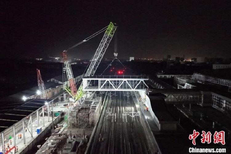 凌晨4點(diǎn),夜幕低垂,正是好夢(mèng)之時(shí),南昌南站(橫崗站)外燈火通明,中聯(lián)重科起重機(jī)和現(xiàn)場(chǎng)施工人員嚴(yán)陣以待。隨著“就位”命令下達(dá),歷時(shí)2個(gè)小時(shí),中聯(lián)重科650噸履帶吊順利將106噸重的鋼桁架天橋橫跨4條鐵路營業(yè)線上方精準(zhǔn)落位。