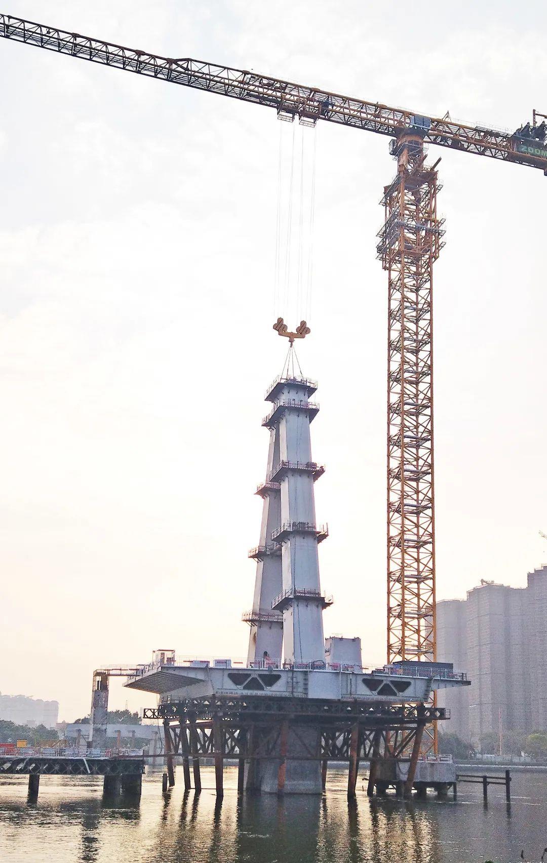 為提升建設(shè)速度、盡量減少施工影響,項(xiàng)目方采取裝配式施工,先制作好大量預(yù)制構(gòu)件,再拉到現(xiàn)場的設(shè)計(jì)位置進(jìn)行拼裝,以“搭積木”的方式建橋。由于建設(shè)過程涉及水上作業(yè)、大件吊裝等重大方案,還具有制作安裝精度要求高、重型吊裝作業(yè)量大、協(xié)調(diào)工作接口多等特點(diǎn),為保證預(yù)制結(jié)構(gòu)順利起吊安裝,項(xiàng)目方、租賃公司攜手中聯(lián)重科,量身定做了超大型塔機(jī)R4300-200。