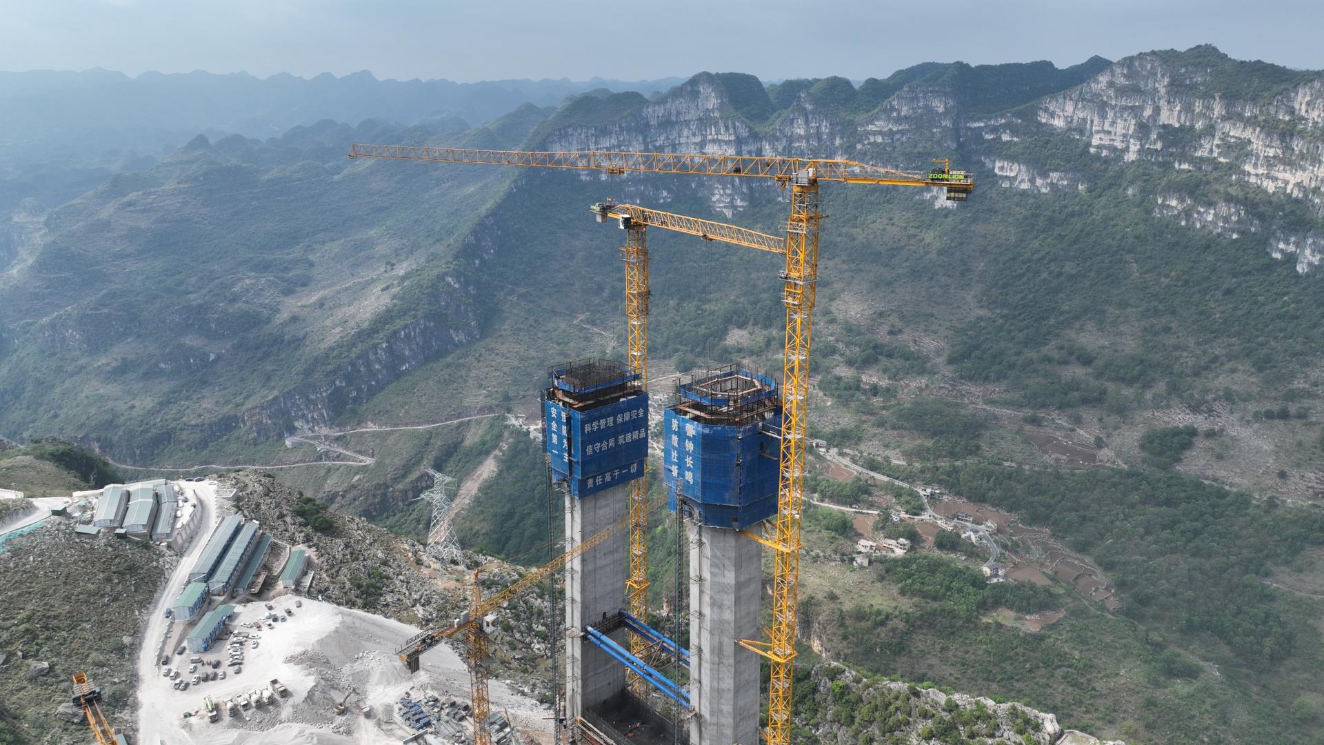 目前,2臺WA7527-20KB平頭塔式起重機(jī)已安裝到280米高度,在5號主塔與6號主塔隔峽相望,拔地而起的高柱聳立于懸崖峭壁,橋下的北盤江宛如藍(lán)色絲帶靜臥于大峽谷的懷抱中。