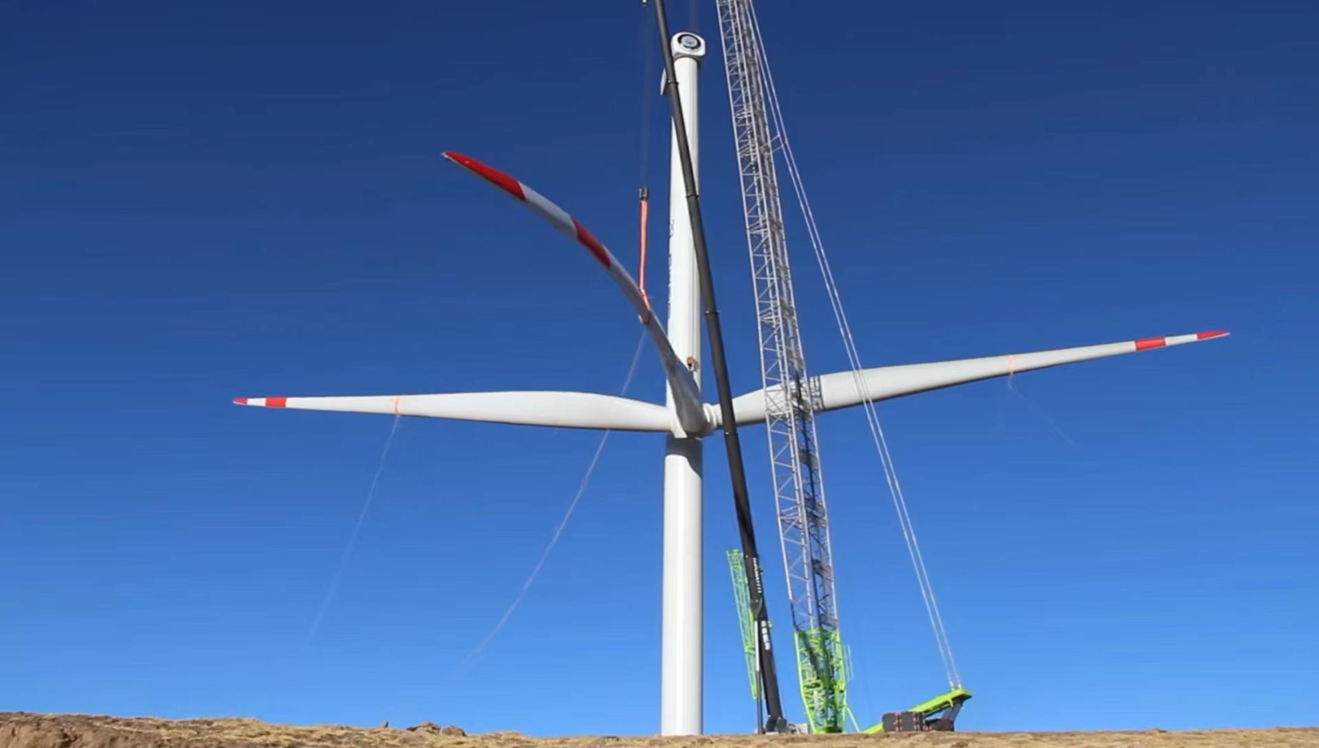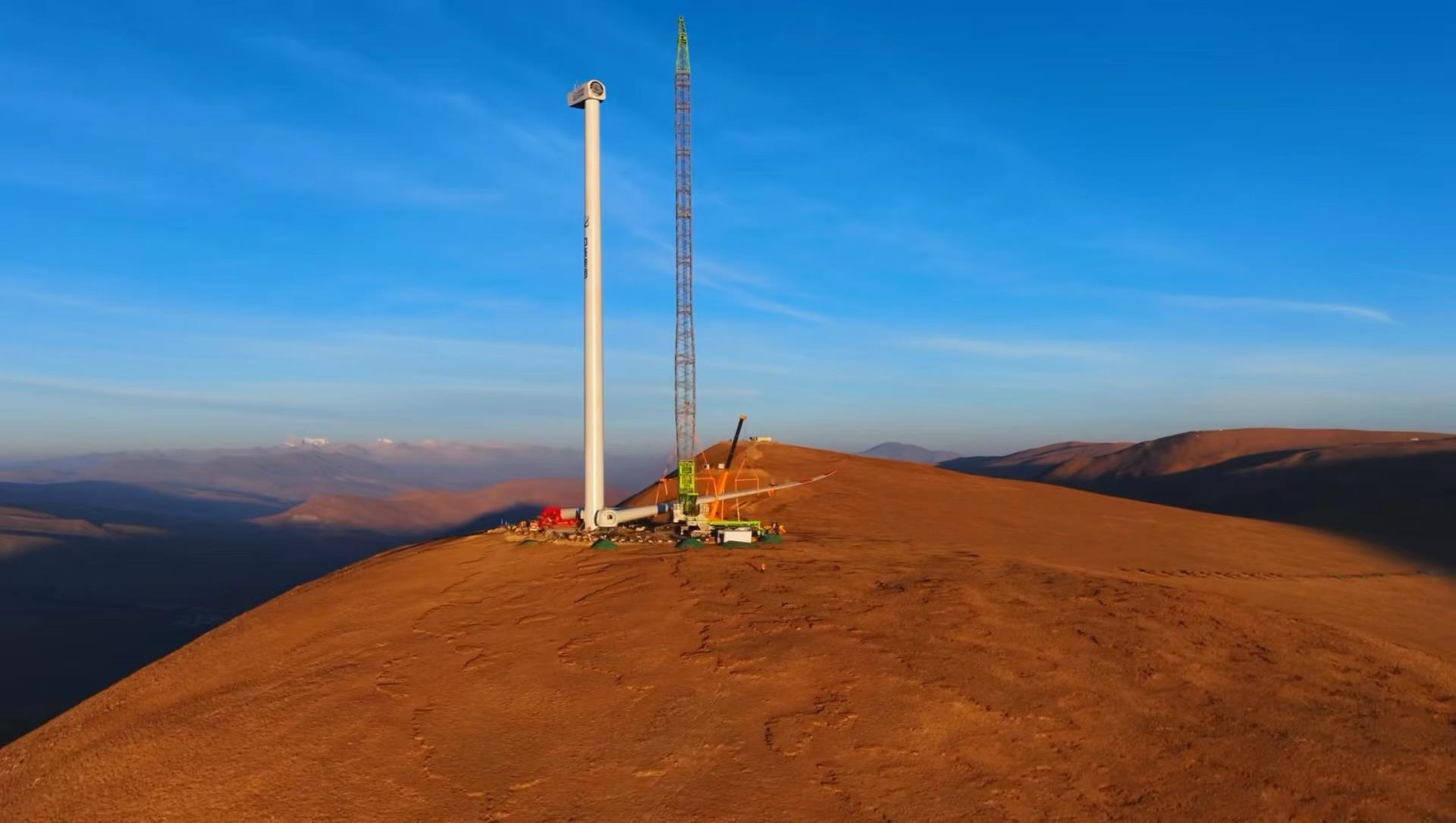 中核薩迦30萬千瓦風(fēng)光儲一體化項目風(fēng)電場區(qū)位于喜馬拉雅山北麓,距離珠穆朗瑪峰僅140公里左右,**高海拔達(dá)到5193米,是目前世界上在建海拔**高、單體容量**大的風(fēng)電項目。此次吊裝風(fēng)機(jī)塔筒高102米,輪轂中心高105米,單葉片長度達(dá)90米,葉輪直徑達(dá)183米,吊裝的基礎(chǔ)海拔即高達(dá)4987米,總海拔高度達(dá)5092米。