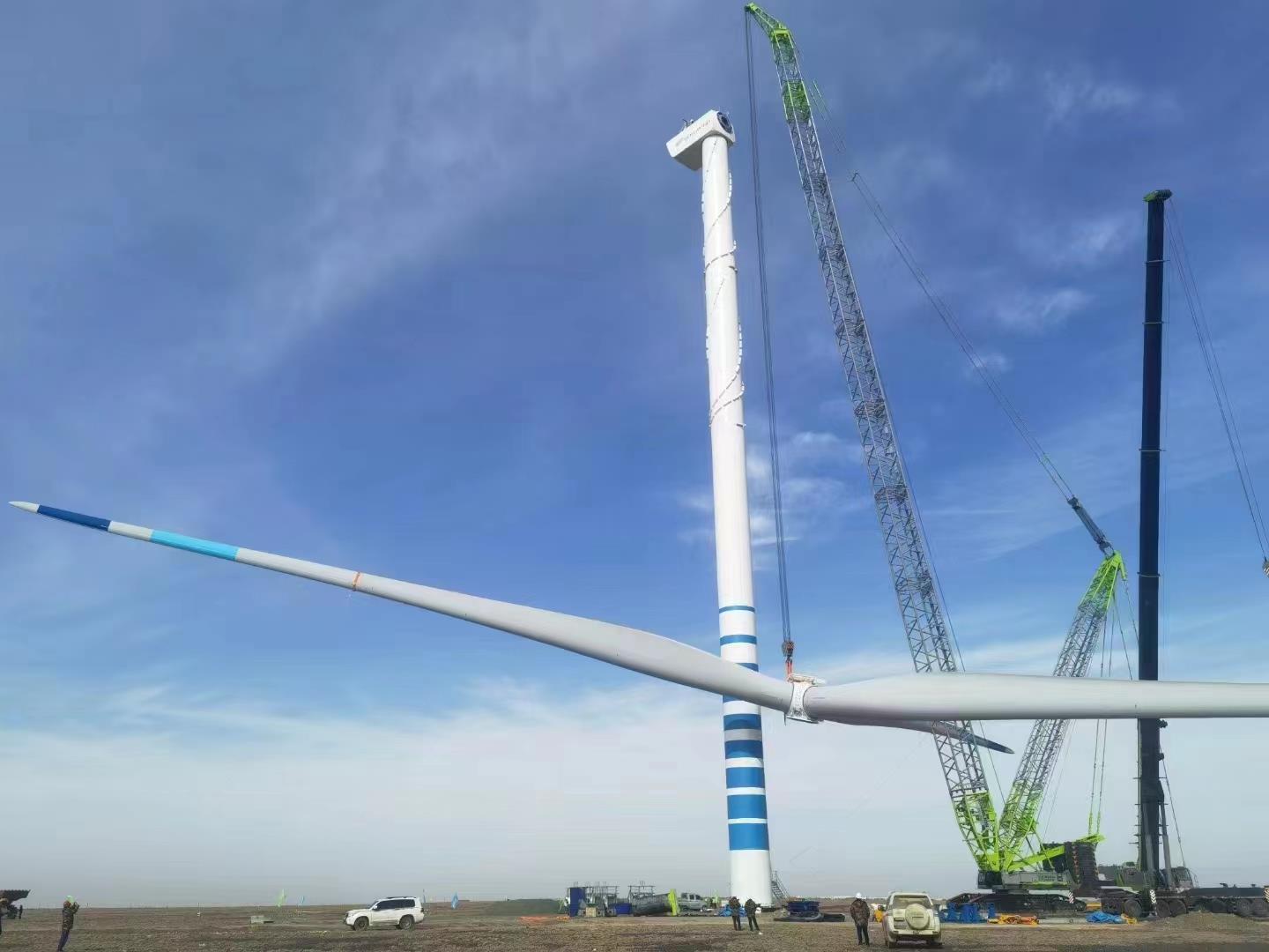 此次中聯重科吊裝的6.7兆瓦風機,是全國陸上單機容量**大風電機組,風機輪轂中心高度110米、相當于30層樓高,葉片長度93米、輪機艙重量134噸。由于地處荒漠,而且進入10月以來當地天氣變化大,作業窗口期時間短,對吊裝設備的性能提出了嚴峻考驗。施工方經過多方考慮,**終選擇了有著“風電王者”美譽的中聯重科ZCC9800W履帶式起重機進行主吊。