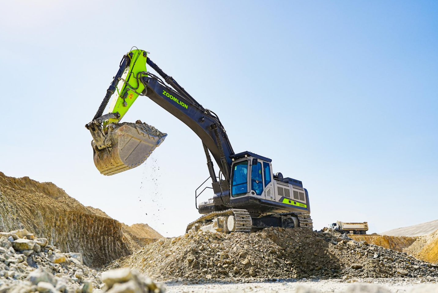 以ZE500G挖掘機為例,中聯重科ZE500G挖掘機重新設計了散熱系統,使后門進風面積大幅加大,散熱能力提升35%;同時高過濾效率和大容灰量的空氣過濾器,搭配油浴式空氣預濾器,能夠有效保護發動機。在舒適性配置上,ZE500G挖掘機采用新一代駕駛室,抵御烈日效果和制冷降溫效果更強,駕駛操縱更加舒適,助力高效作業。
